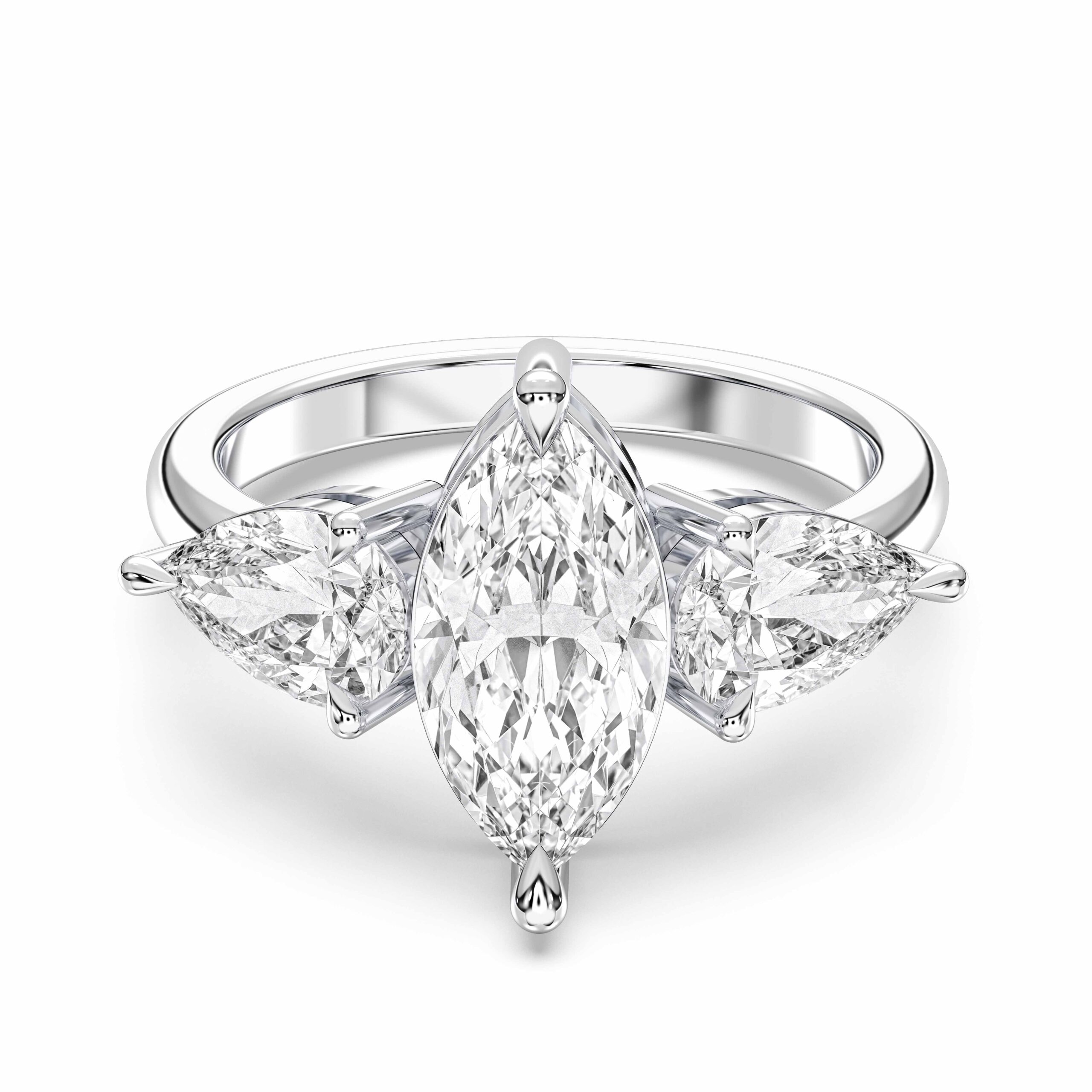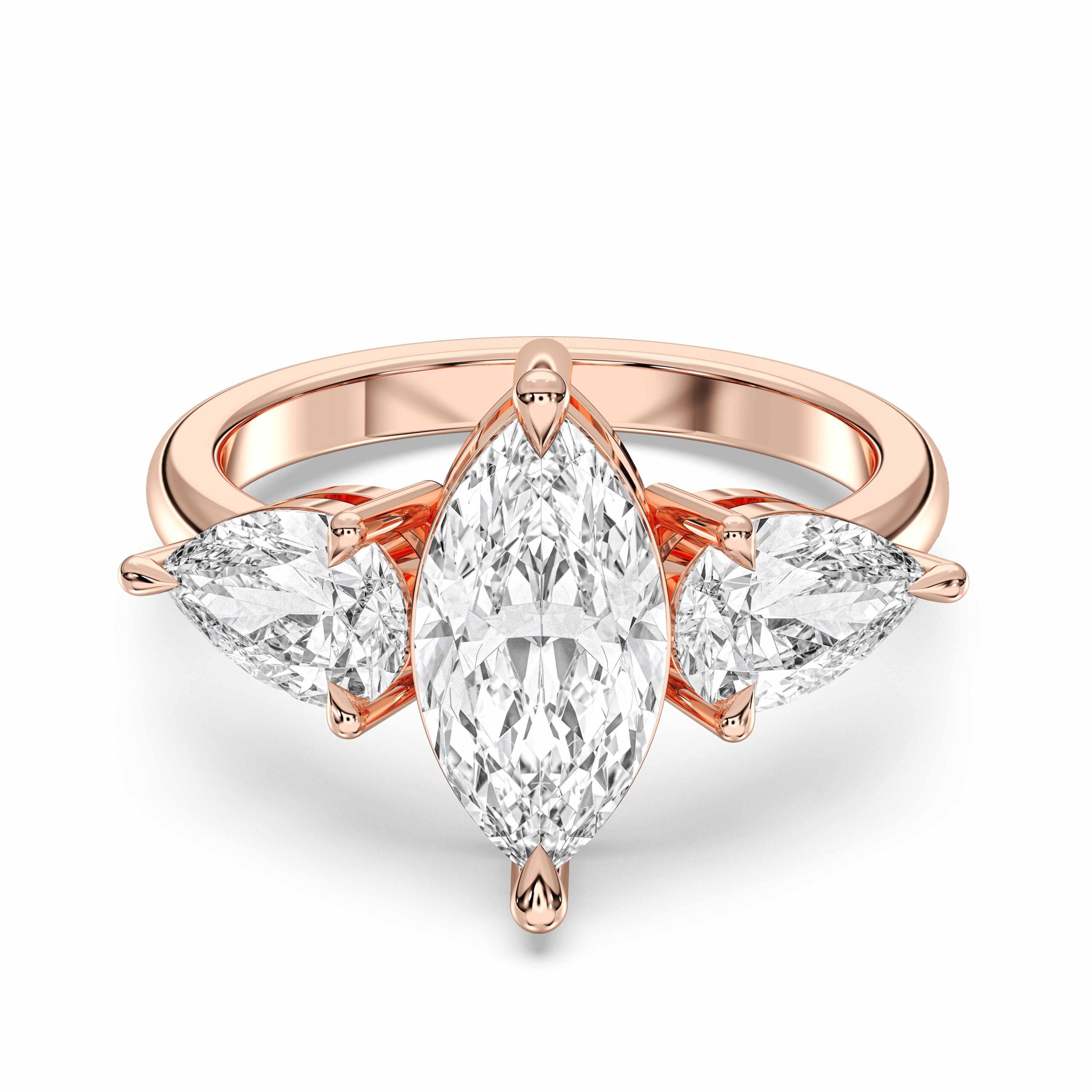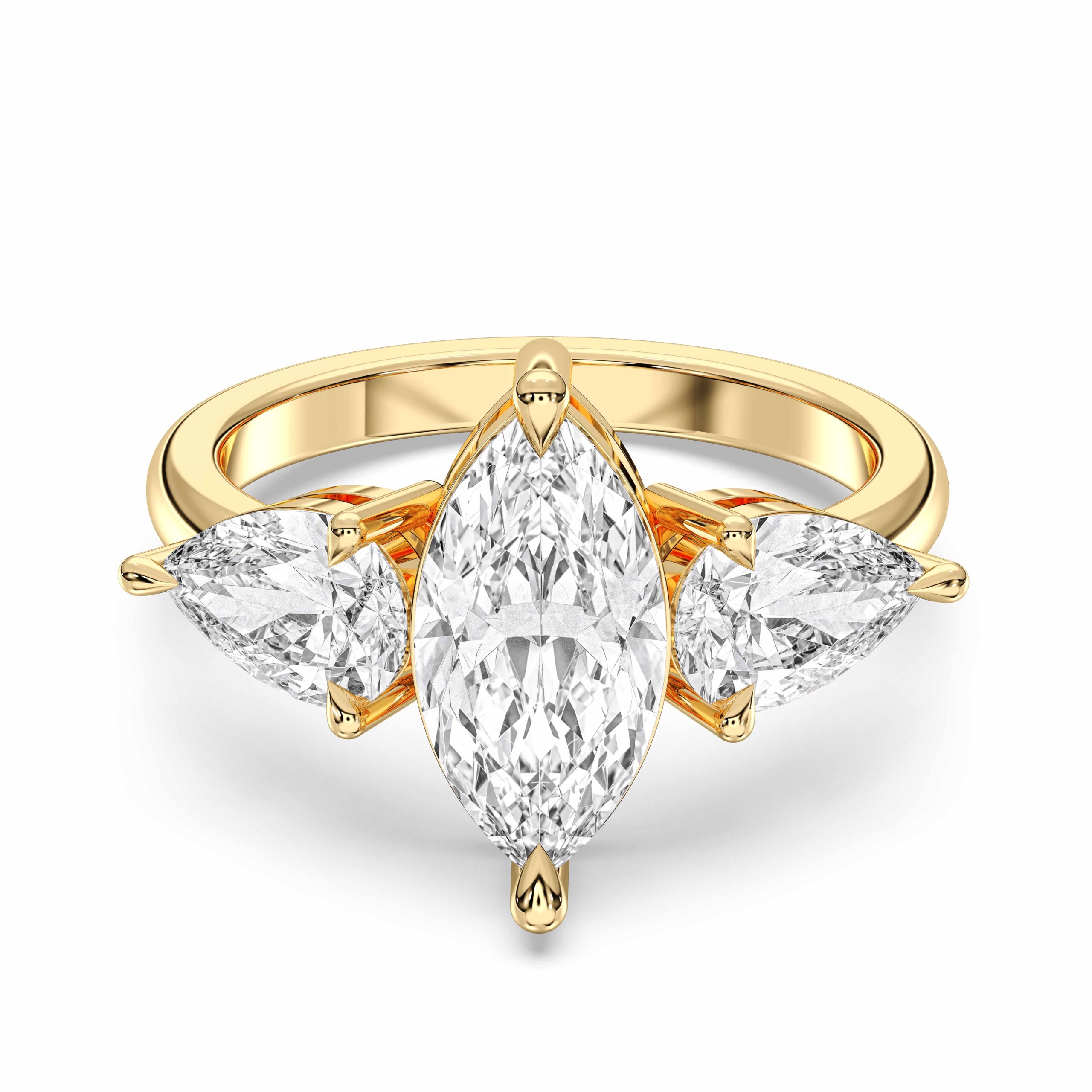 This 3-stone ring uniquely pairs pear-shaped and marquise side stones around a center diamond, creating a dynamic composition of light and shape. Artistic and deeply symbolic, it represents past, present, and future.