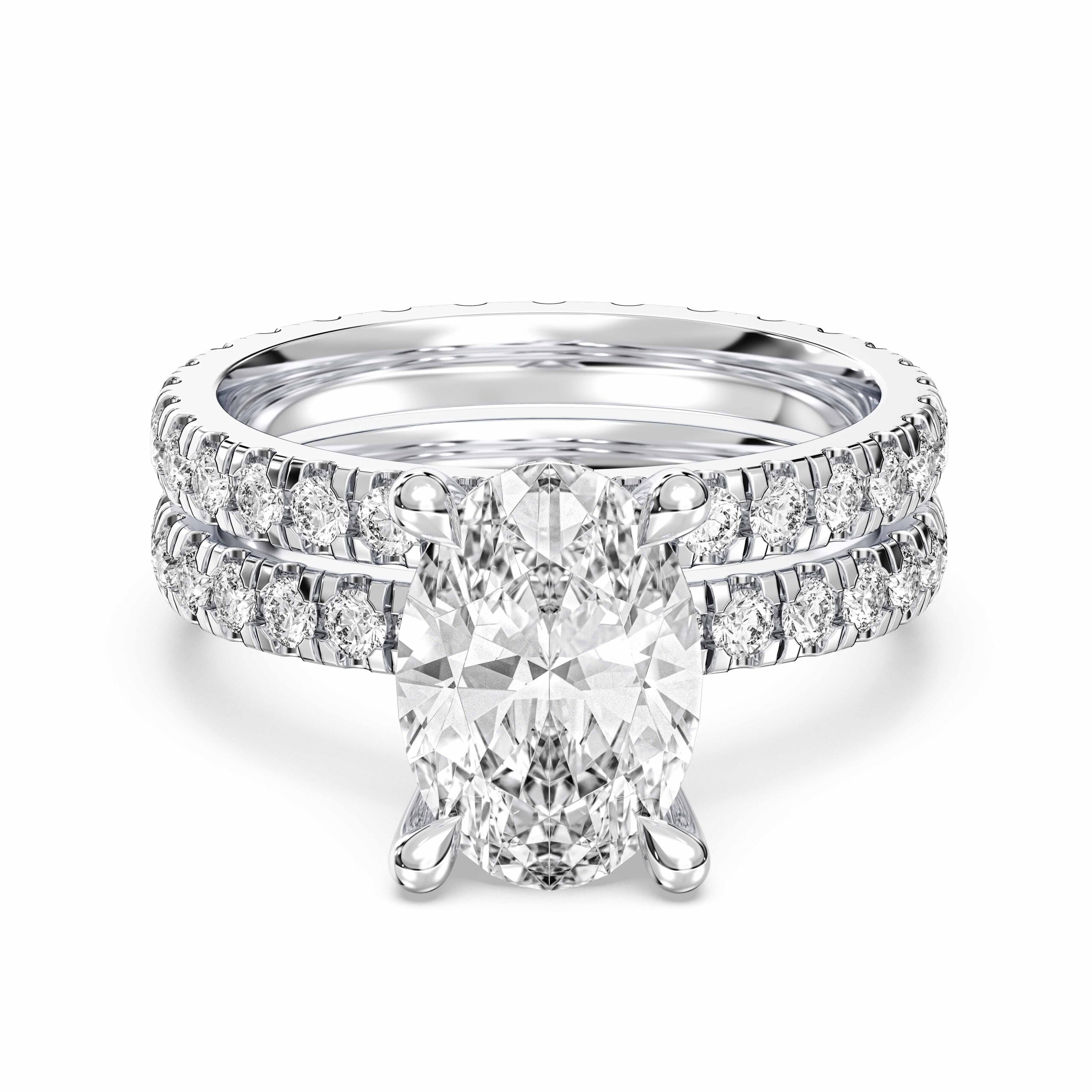 This delicate bridal set features an oval center stone held above a diamond pavé band, radiating elegance and sparkle. The matching band completes a harmonious and sophisticated look.