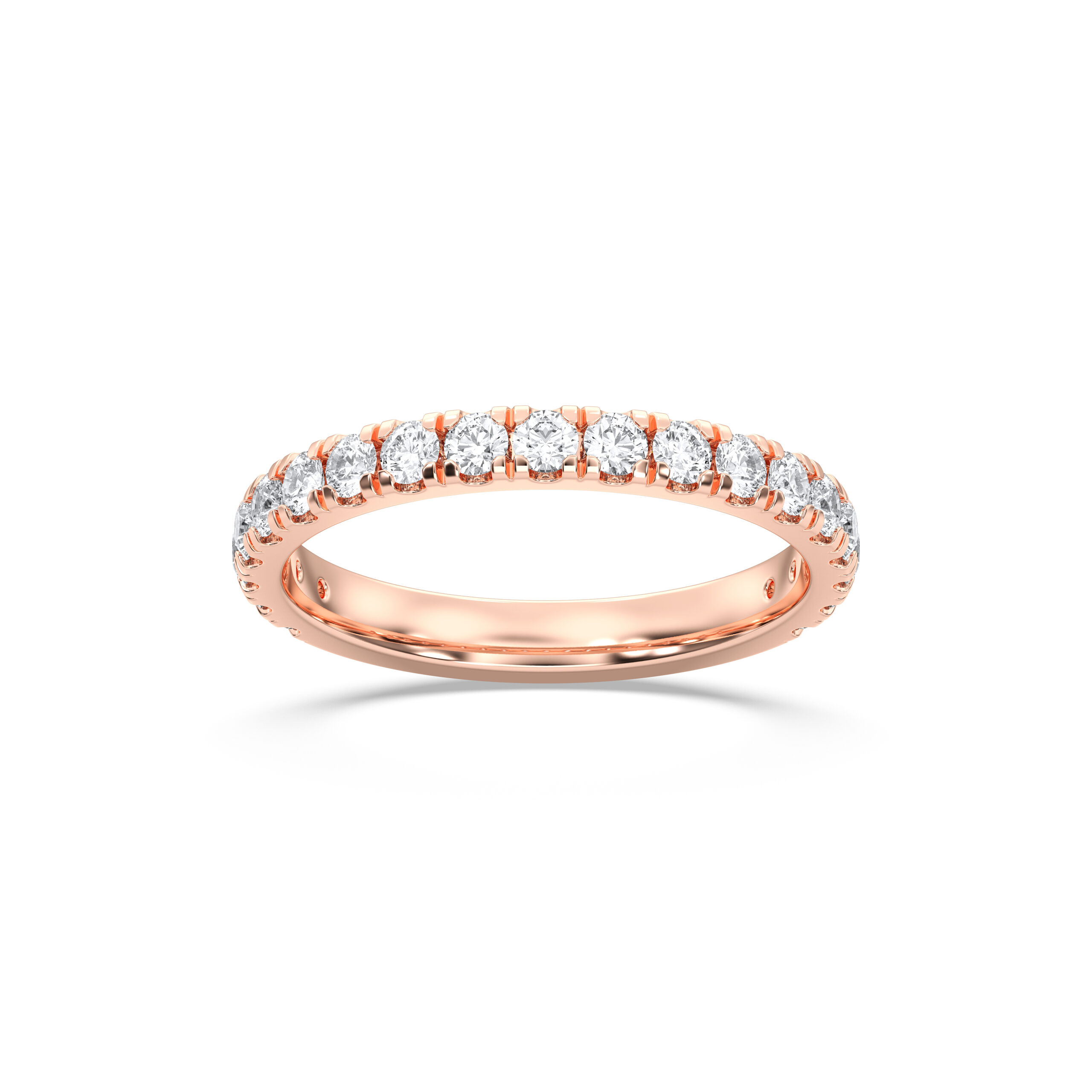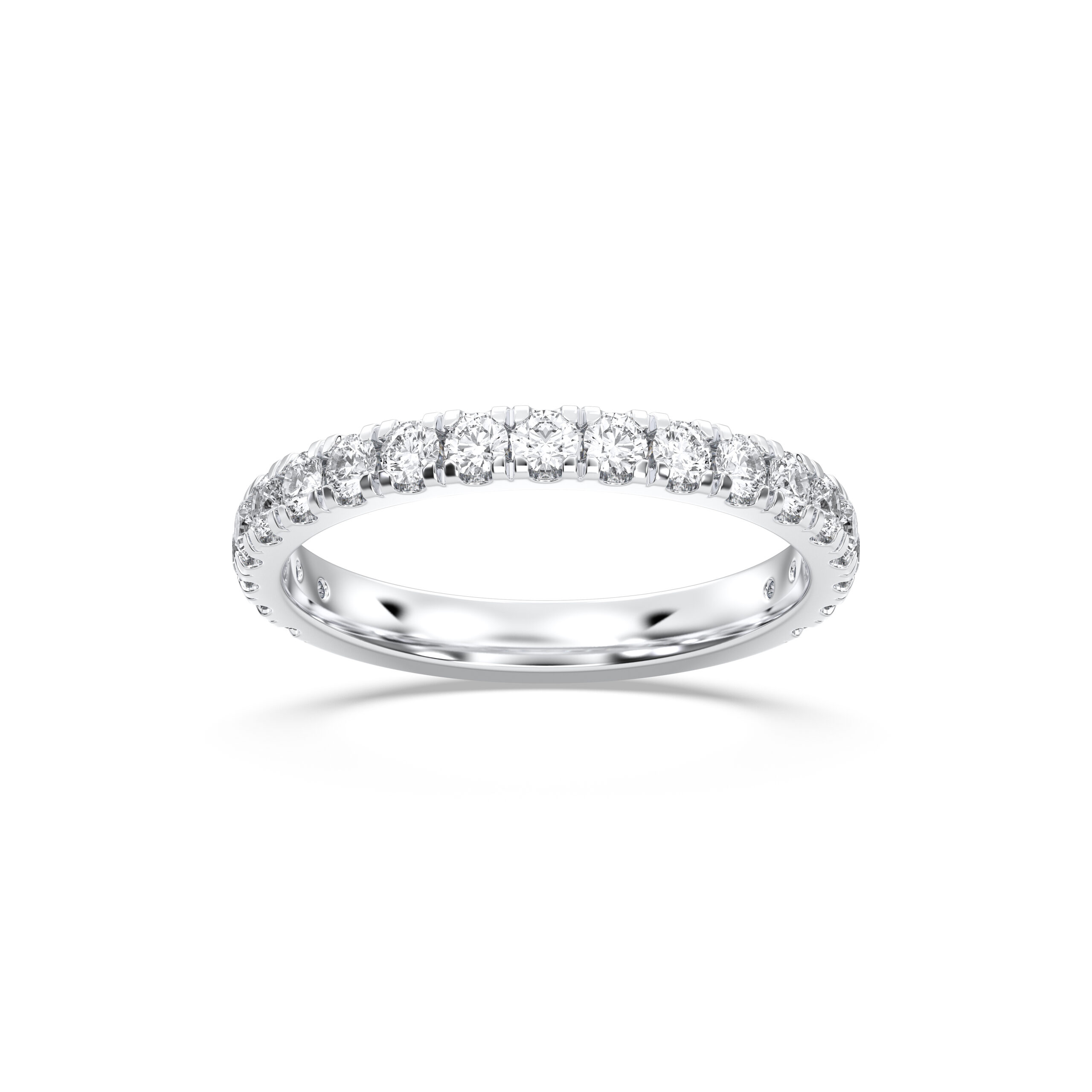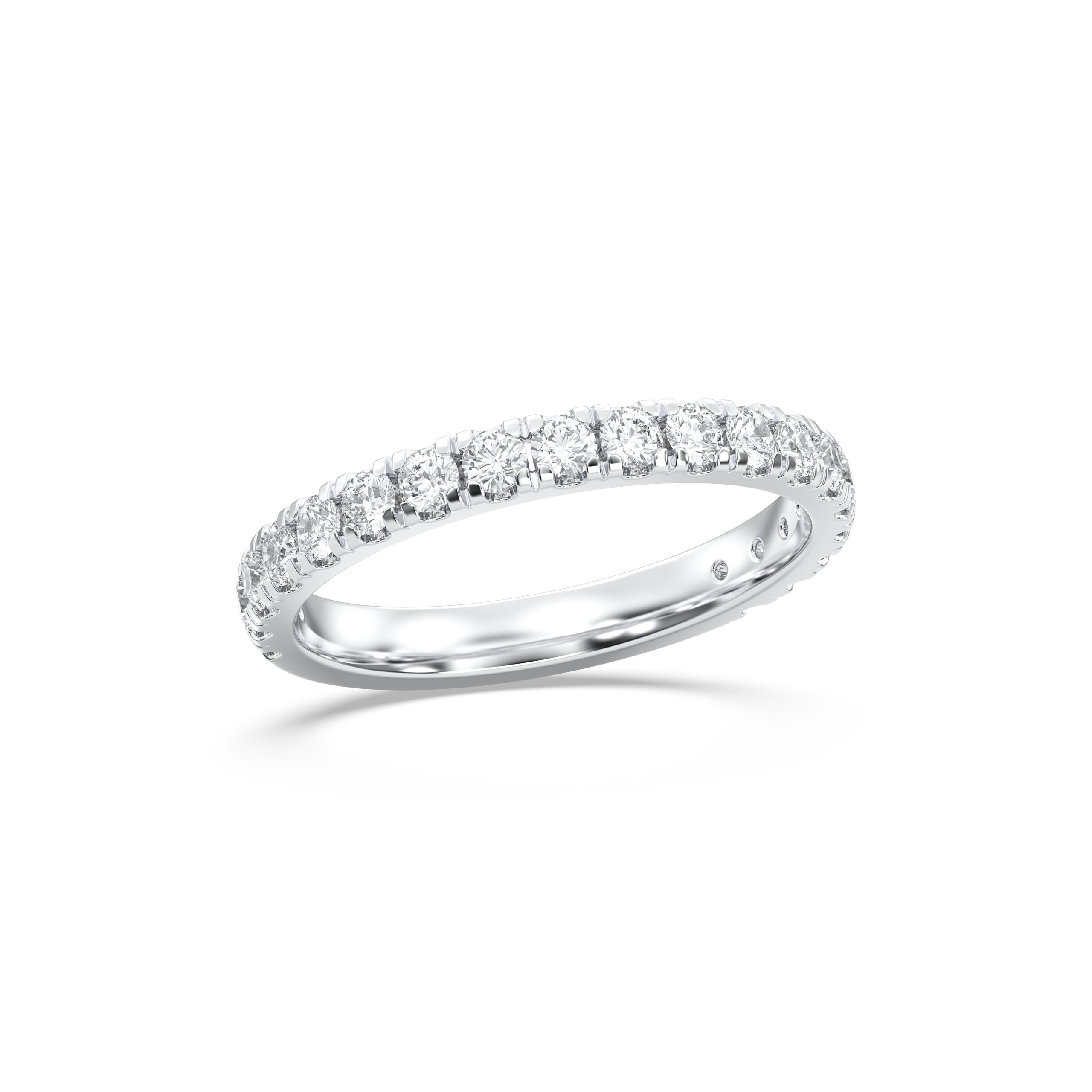 This Round 3/4 Anniversary Band combines comfort and radiance with diamonds set across 75% of the ring. Ideal for daily wear, the open back ensures easy resizing while preserving the luxurious sparkle of perfectly matched diamonds.
