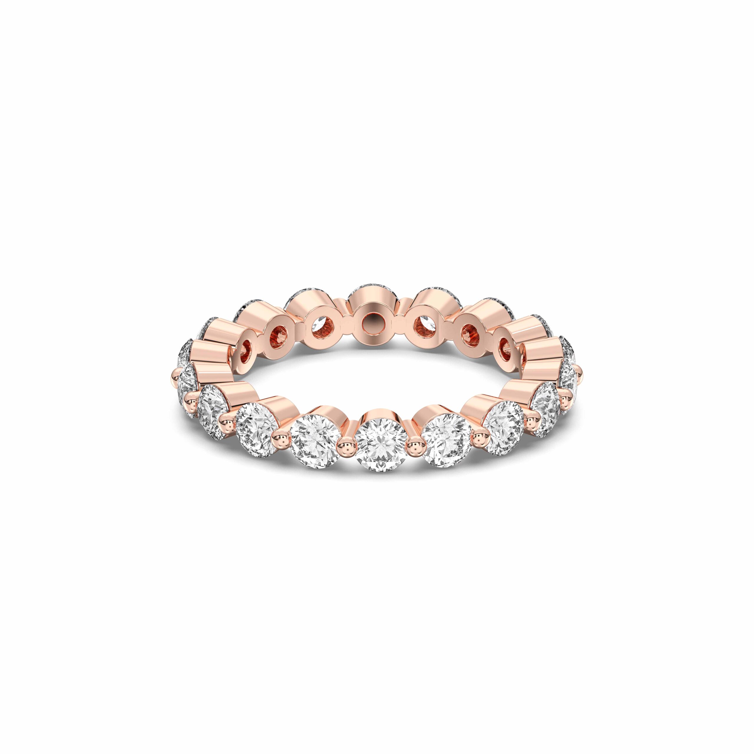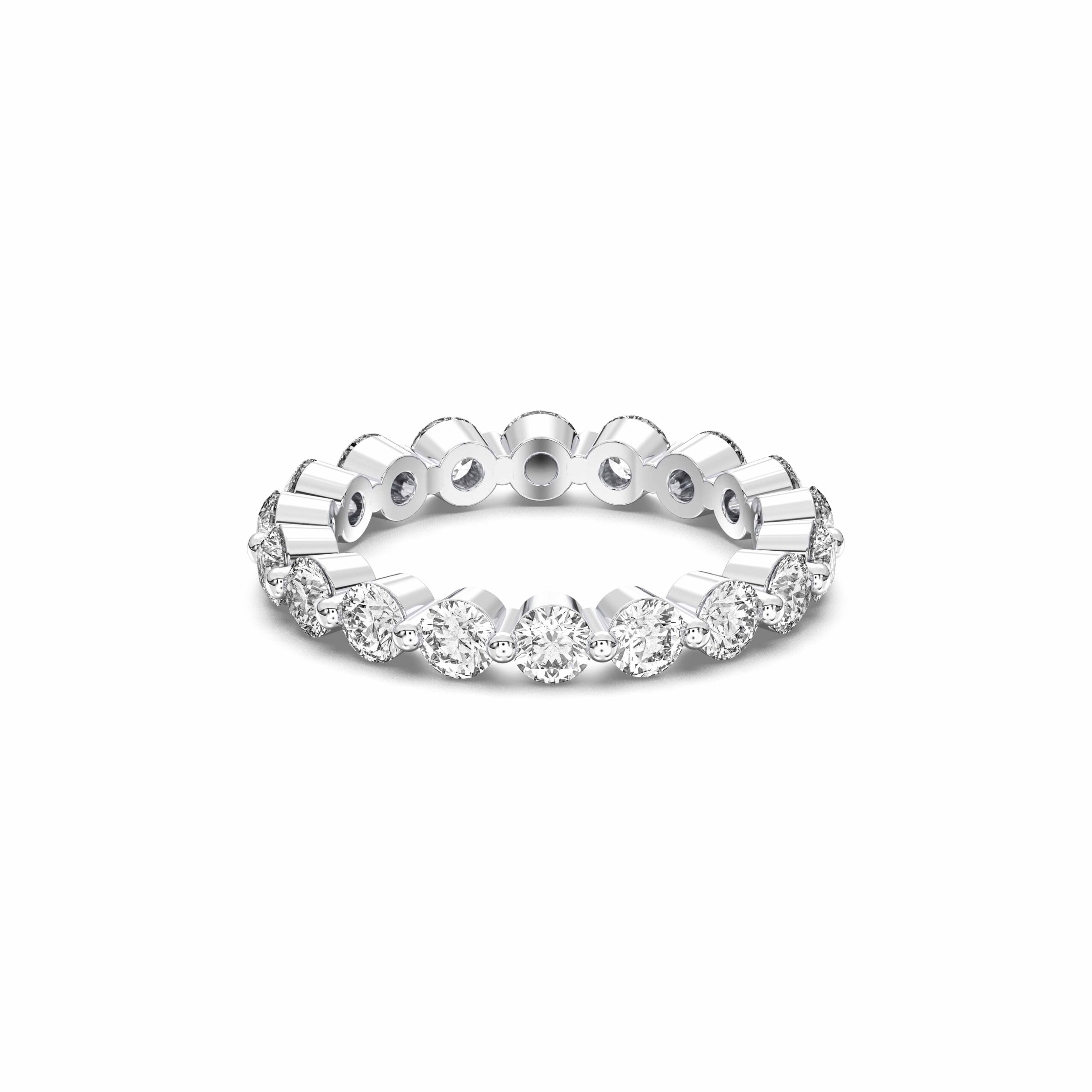 A chic take on the classic eternity band, this ring features round diamonds enclosed in smooth, protective bezels — offering a sleek, modern finish with uninterrupted shine. Perfect for women who appreciate elegance with a contemporary touch.